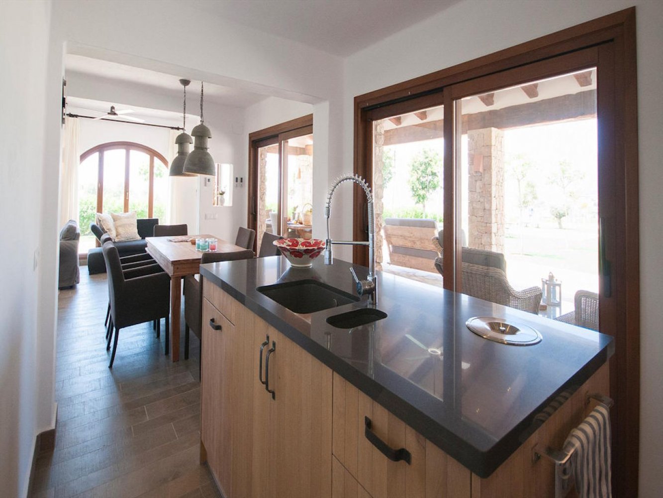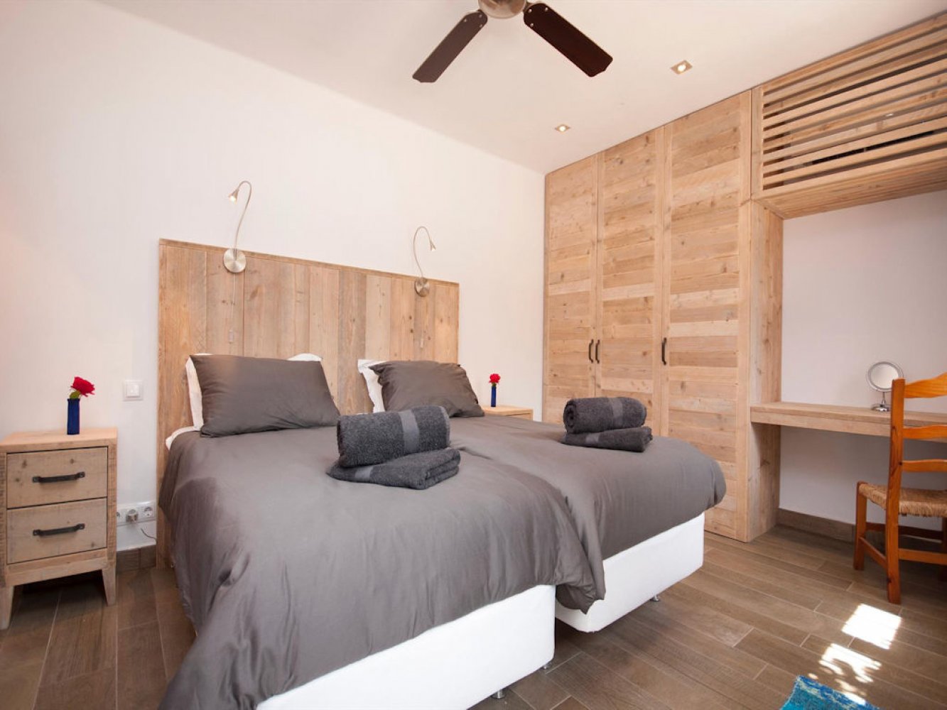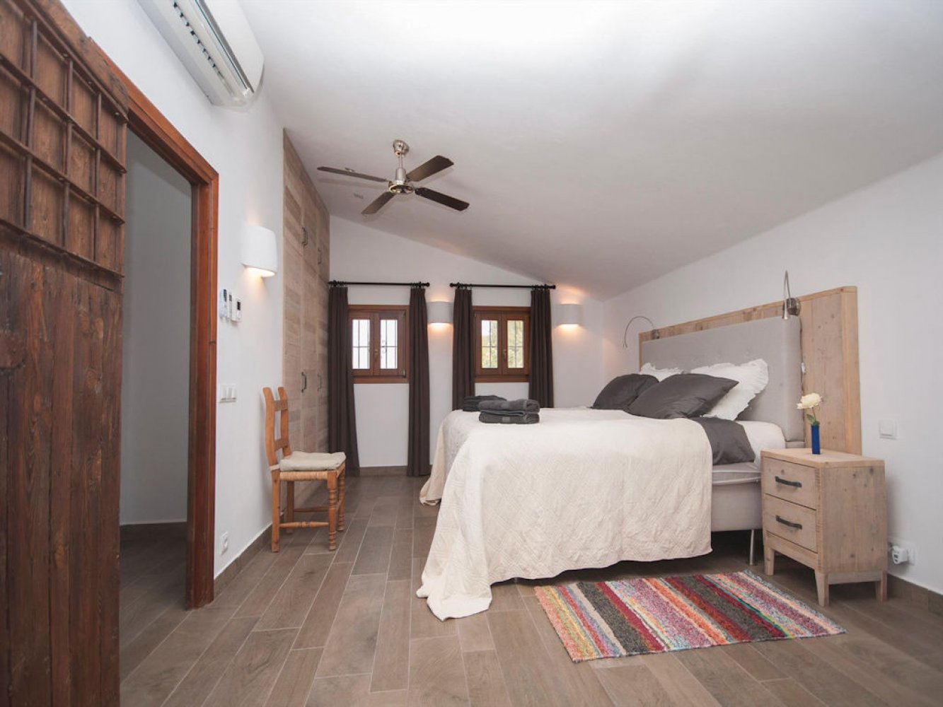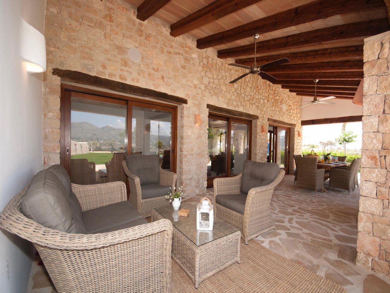 Diese luxuriöse Finca erstreckt sich über zwei Etagen und verfügt über einen lichtdurchfluteten Wohn- und Essbereich mit Sat-TV, eine voll ausgestattete Küche mit Geschirrspülmaschine, einen Waschraum mit Waschmaschine, drei Doppelschlafzimmer sowie ein modernes Badezimmer. Vom Wohn- und Essbereich gelangen Sie auf eine schöne überdachte Terrasse und die große Poolterrasse. Das Grundstück des Anwesens ist komplett abgeschlossen. Hier finden Sie eine Außenküche, eine Außendusche uund eine große Liegewiese die den Poolbereich umgibt. Ein Parkplatz steht Ihnen direkt auf dem Grundstück zur Verfügung.