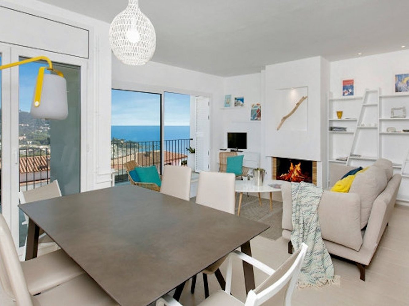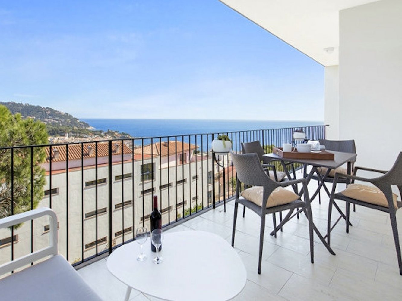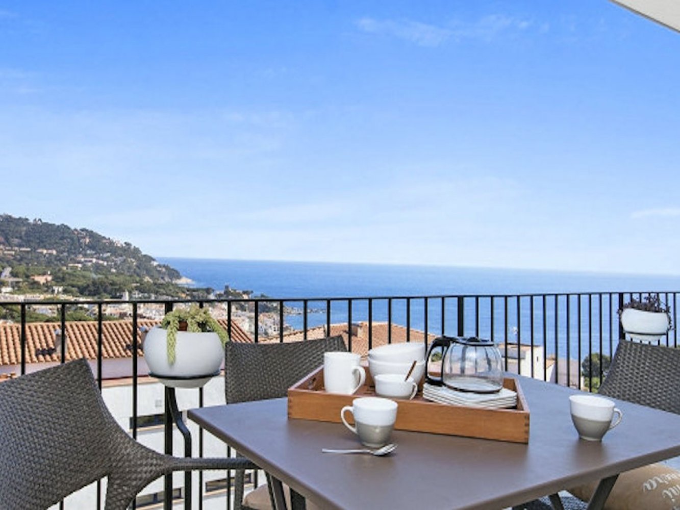 Exklusives Appartement in Calella de Palafrugell an der Costa Brava mit atemberaubendem Panoramablick auf das Mittelmeer. Die Ferienwohnung befindet sich nur 700 Meter vom Sandstrand entfernt und bietet Zugang zu einer gepflegten mediterranen Ferienanlage mit Tennisplätzen, Liegewiese, Außenduschen und großem Swimmingpool.