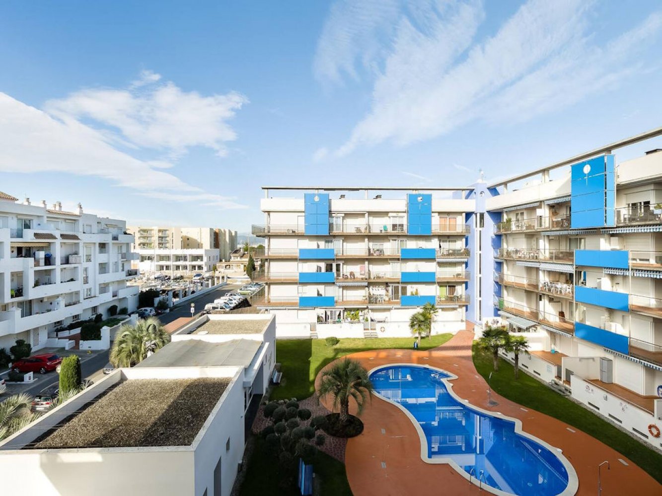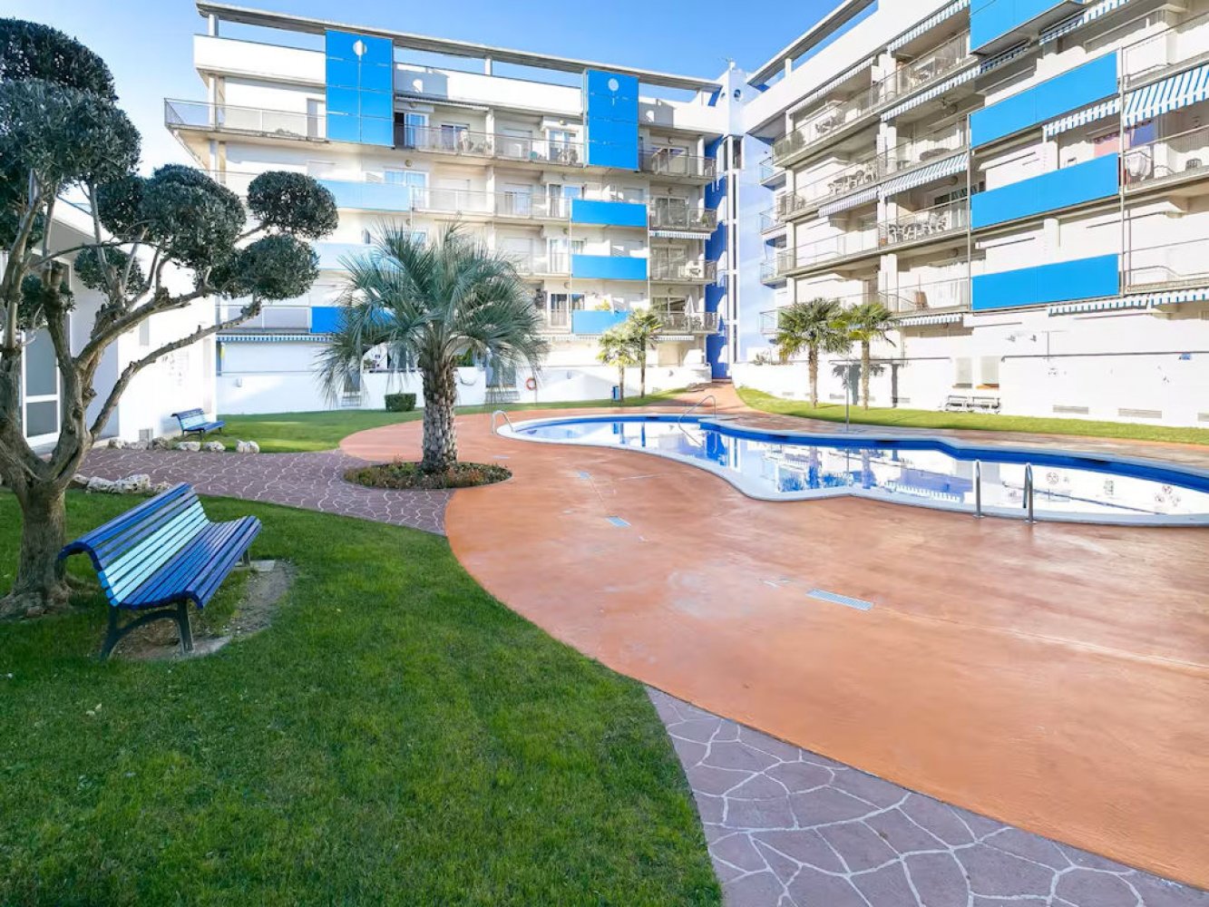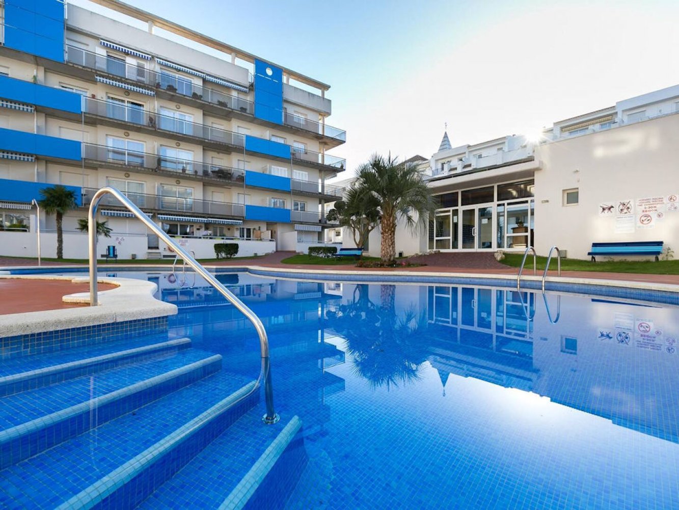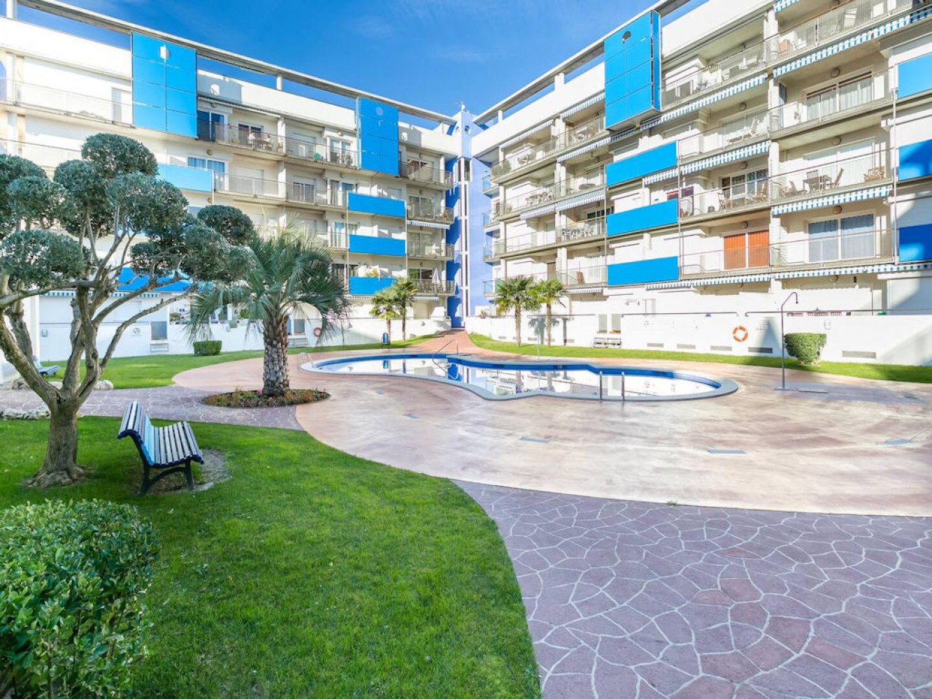 Modern holiday apartment in Santa Margarita near Roses on the Costa Brava, Spain. The apartment is part of a well-maintained Mediterranean holiday complex with a sunbathing lawn, large pool terrace, and swimming pool.
