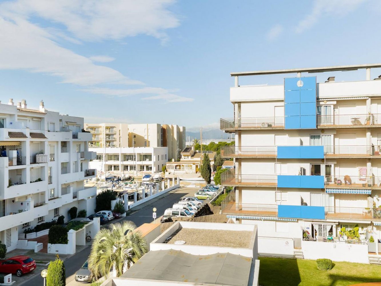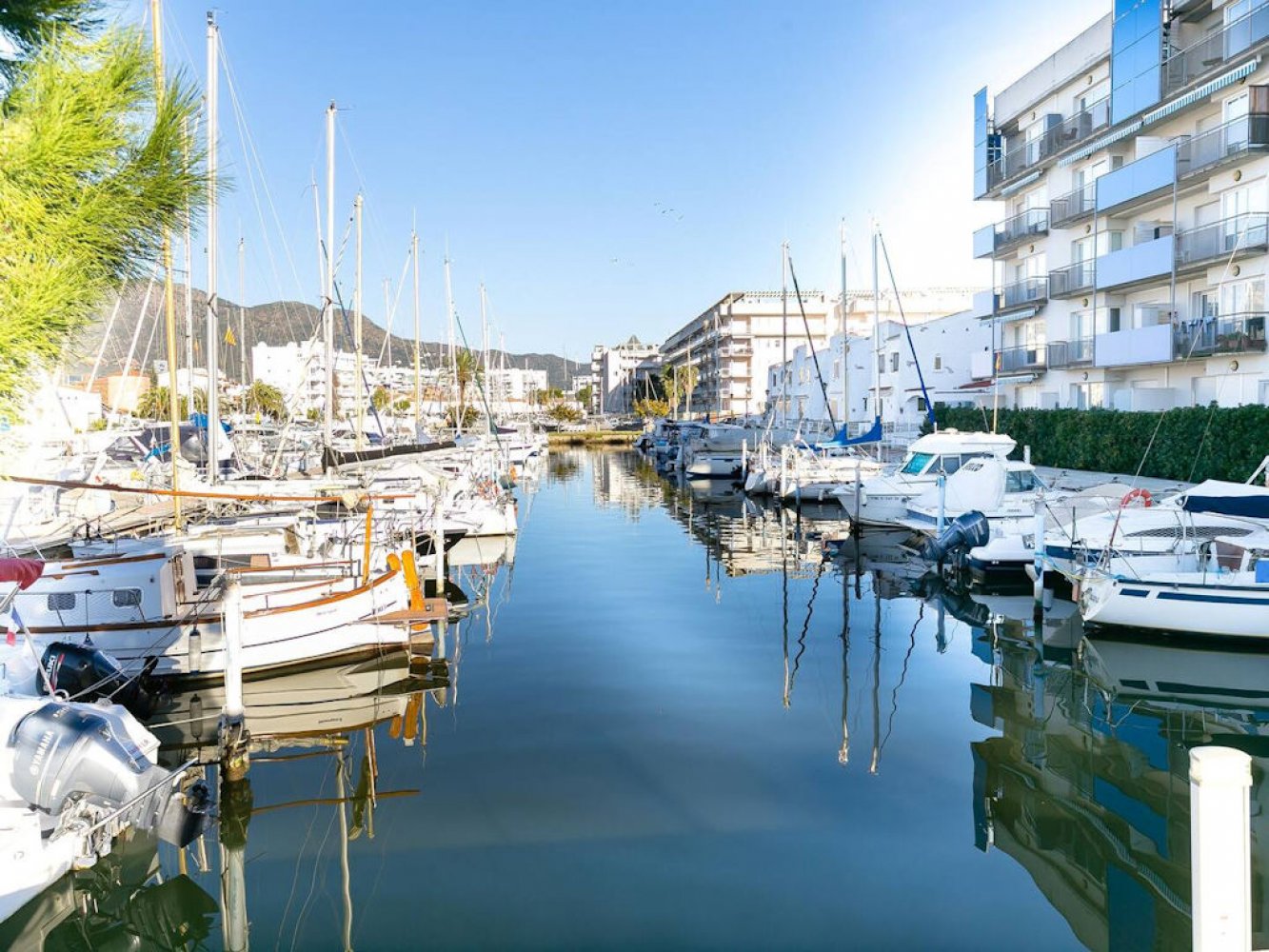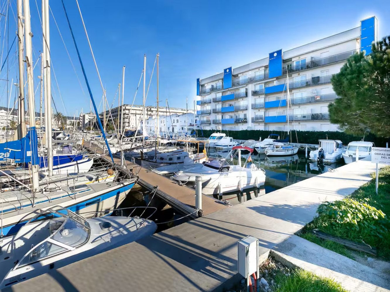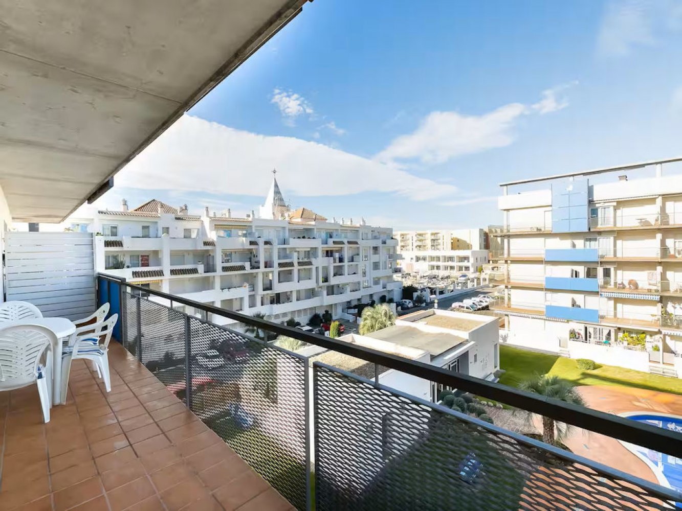 Modern holiday apartment in Santa Margarita near Roses on the Costa Brava, Spain. The apartment is part of a well-maintained Mediterranean holiday complex with a sunbathing lawn, large pool terrace, and swimming pool.