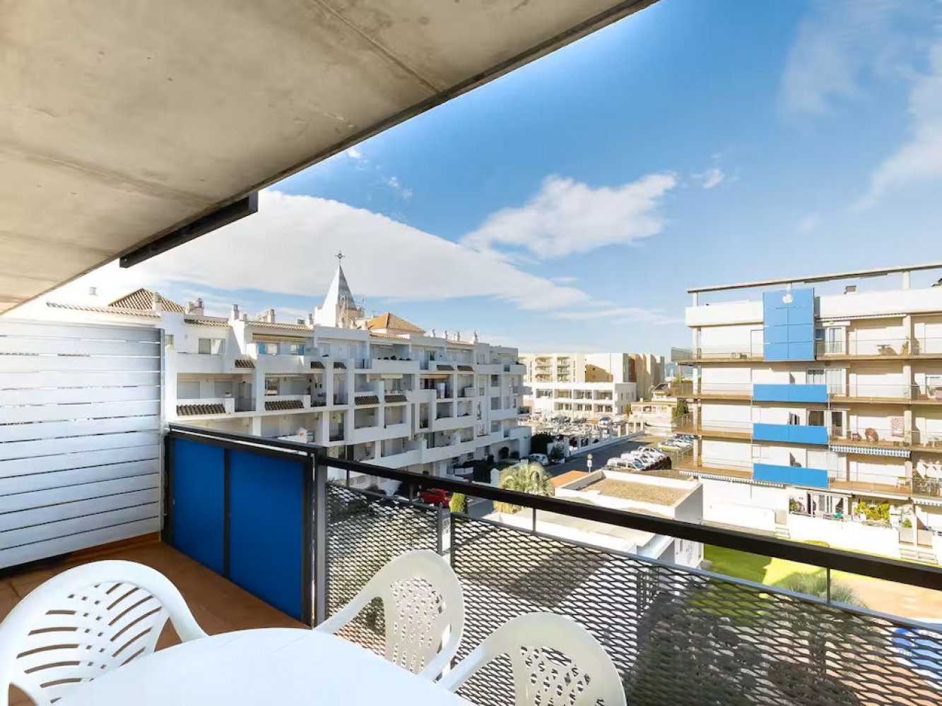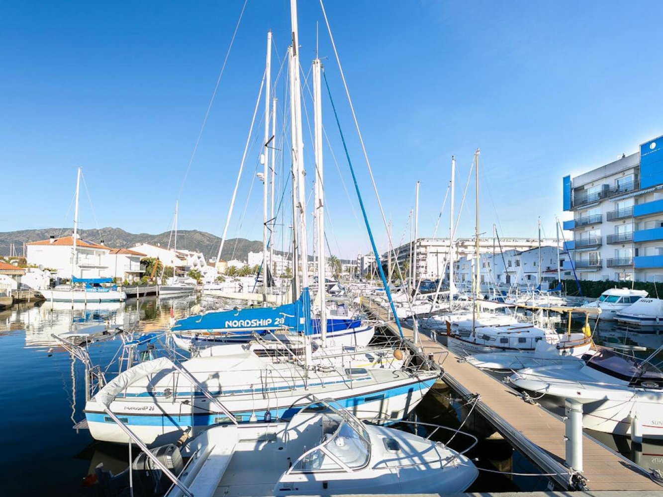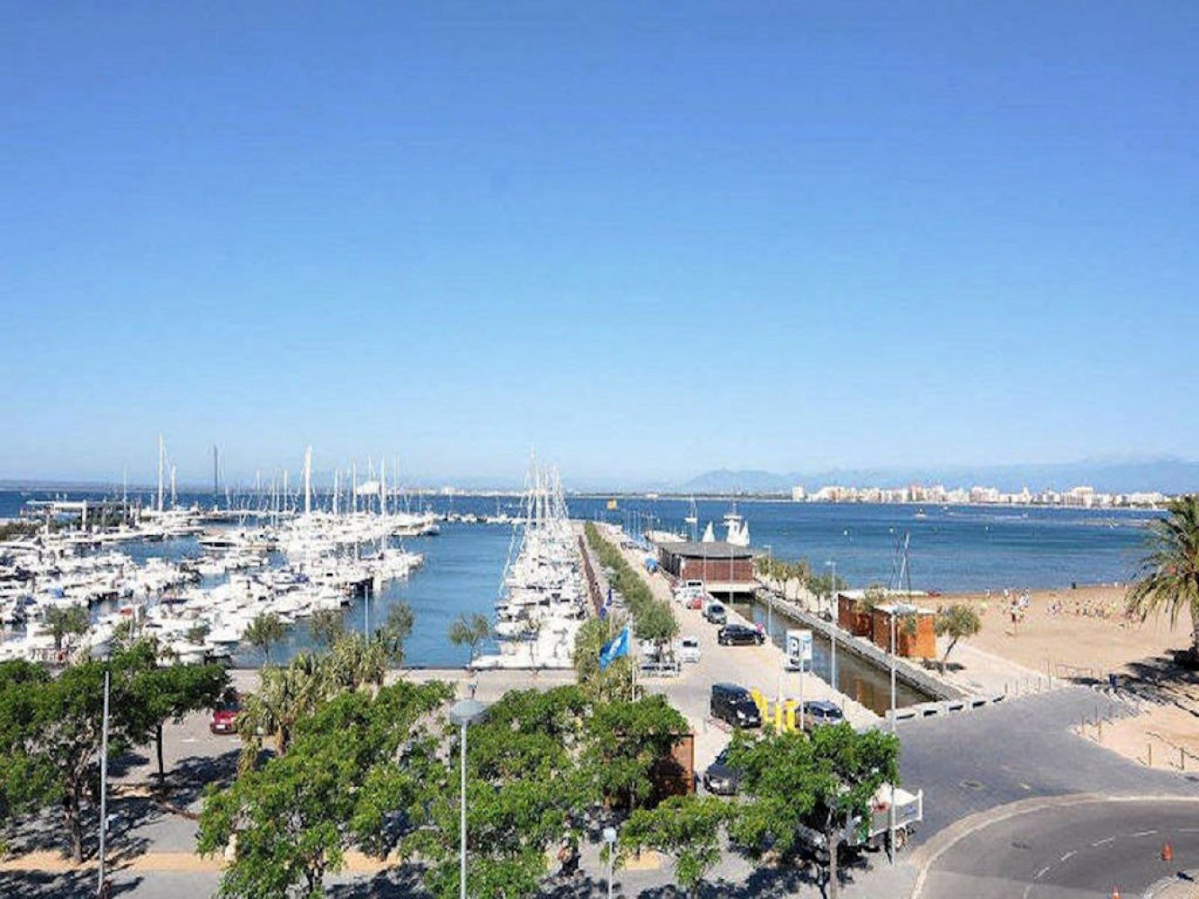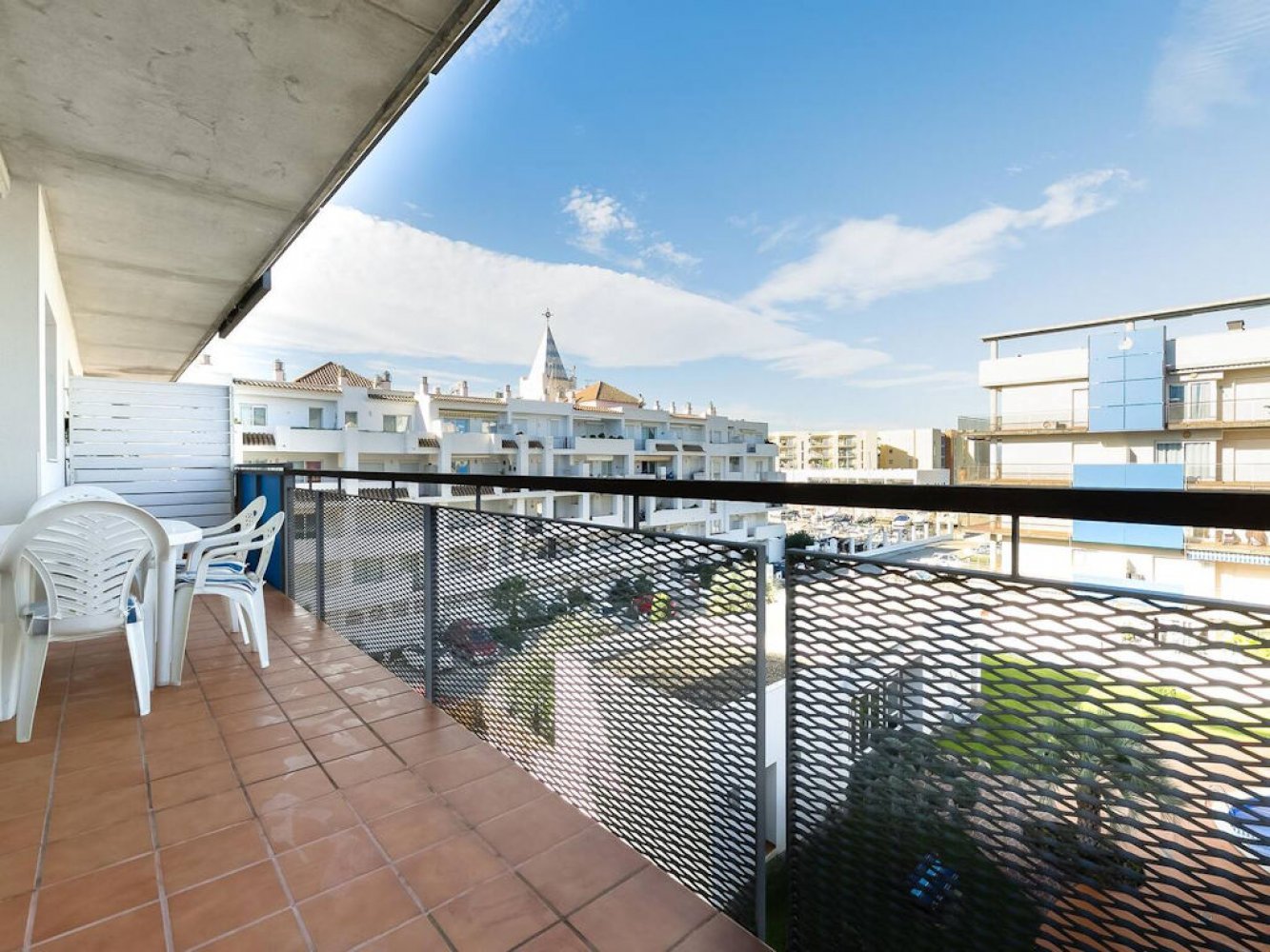 Modern holiday apartment in Santa Margarita near Roses on the Costa Brava, Spain. The apartment is part of a well-maintained Mediterranean holiday complex with a sunbathing lawn, large pool terrace, and swimming pool.