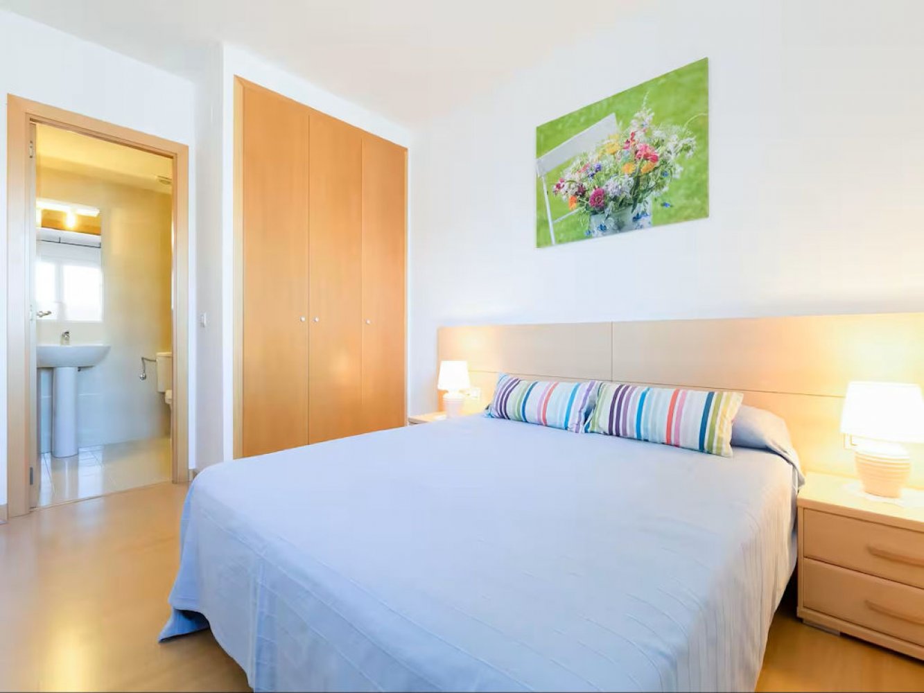 The apartment is located on the 3rd floor and features a bright living and dining area with satellite TV, a fully equipped modern kitchen with washing machine, two double bedrooms, and two modern bathrooms. From the living/dining area, you have access to a lovely balcony with views over the holiday complex. A private parking space is included.