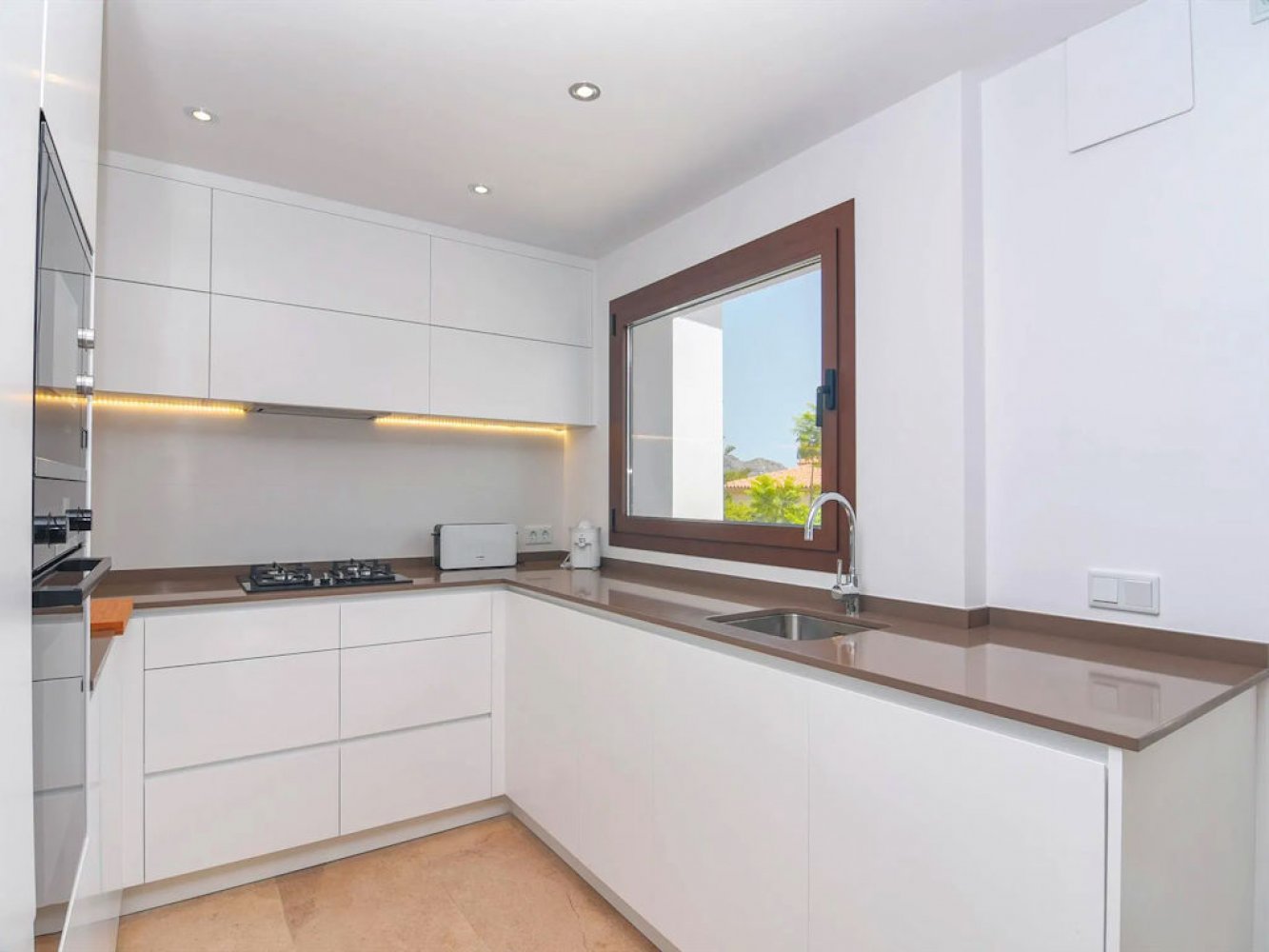 The spacious villa spans two floors and features a bright living and dining area with fireplace and satellite TV, a modern fully equipped kitchen with dishwasher, a utility room with washing machine and dryer, three double bedrooms, three modern bathrooms, and a separate guest toilet. From the living and dining area, you can access the expansive pool terrace and a modern outdoor kitchen. Set on a fully enclosed plot, the Mediterranean-style property offers several terraces, chill-out areas, and a large sun terrace with outdoor shower surrounding the generous private swimming pool. Two covered parking spaces are also available on the property.