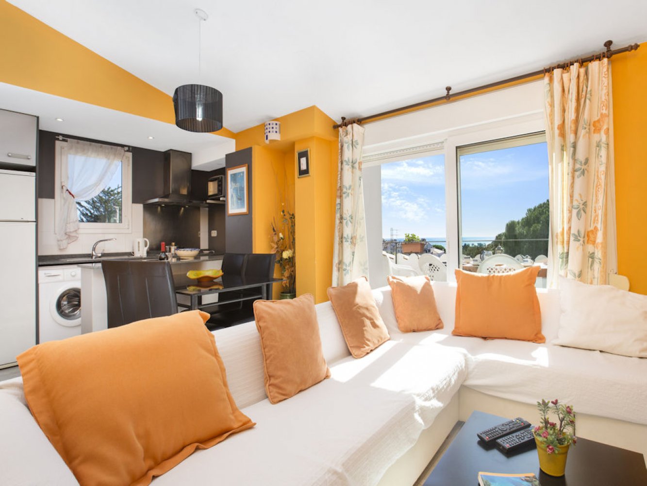The apartment spans the second floor and features a bright living and dining area with a fireplace and TV. From the living area, you have access to a spacious balcony offering breathtaking panoramic views of the Mediterranean. The modern kitchen is fully equipped and includes a dishwasher and washing machine. The penthouse has two double bedrooms, each with access to a rooftop terrace with panoramic views over the town, and a modern bathroom. The property is enclosed, and a private parking space is available.