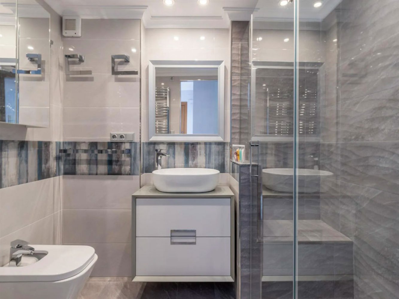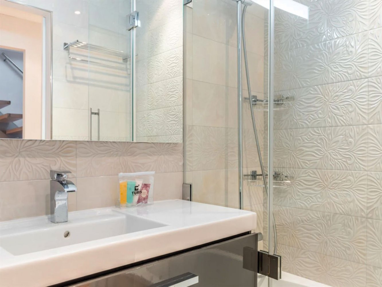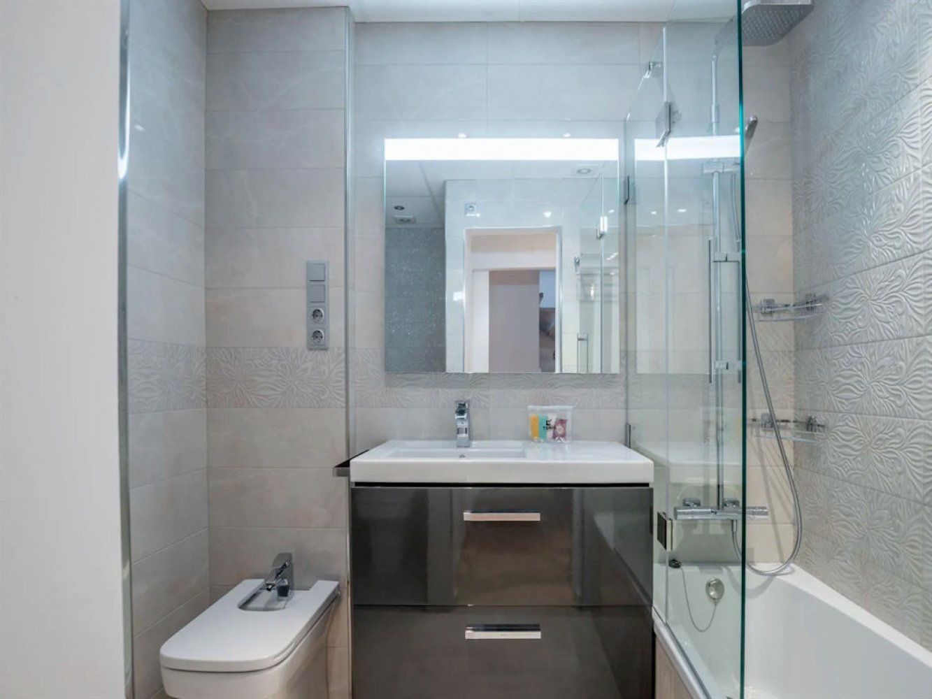 Cet appartement au rez-de-chaussée dispose d’un lumineux séjour avec coin repas et télévision, d’une cuisine moderne entièrement équipée avec lave-vaisselle, lave-linge et sèche-linge, de trois chambres doubles et de trois salles de bains modernes. Depuis le séjour, vous accédez à une belle terrasse offrant une vue exceptionnelle sur la Méditerranée. Une place de parking dans le garage souterrain de l’immeuble est incluse.